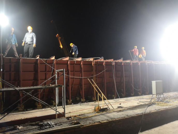 汝陽項目四級堰夜晚加班澆筑上游鋪蓋